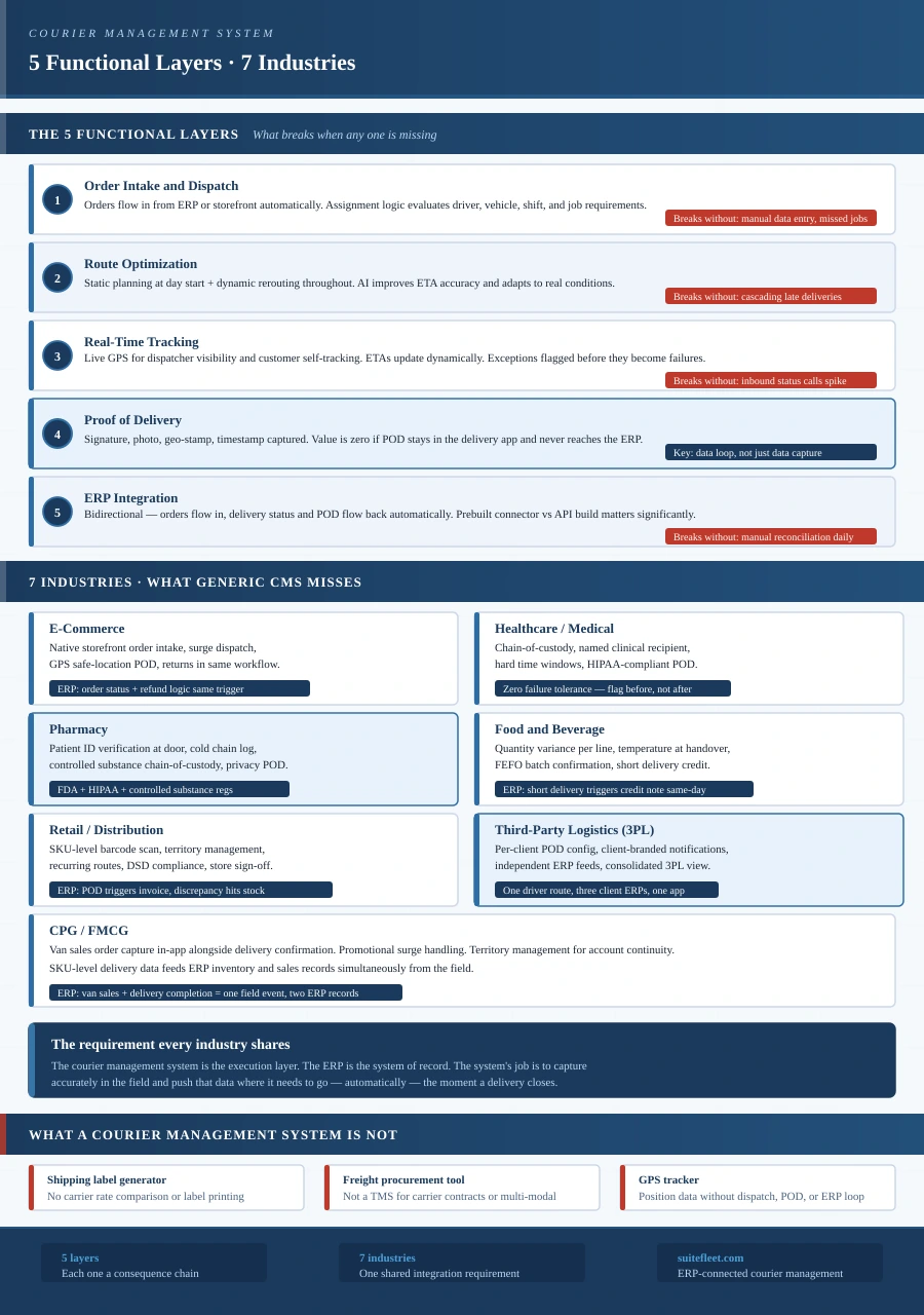 This guide covers both layers. First, the five functional layers of a courier management system and what good looks like at each one. Then, seven industries and what each one requires from the system beyond the standard feature set.