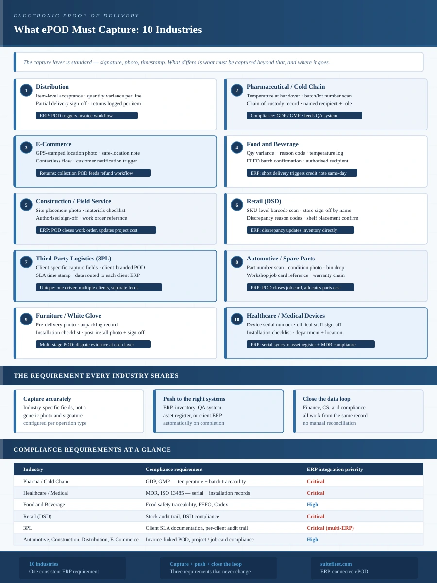 This guide covers ten industries. For each one, it covers the delivery reality, what standard ePOD typically misses, what the platform needs to capture, and what the downstream data requirements are. The cross-industry comparison table at the end maps all ten against four criteria.